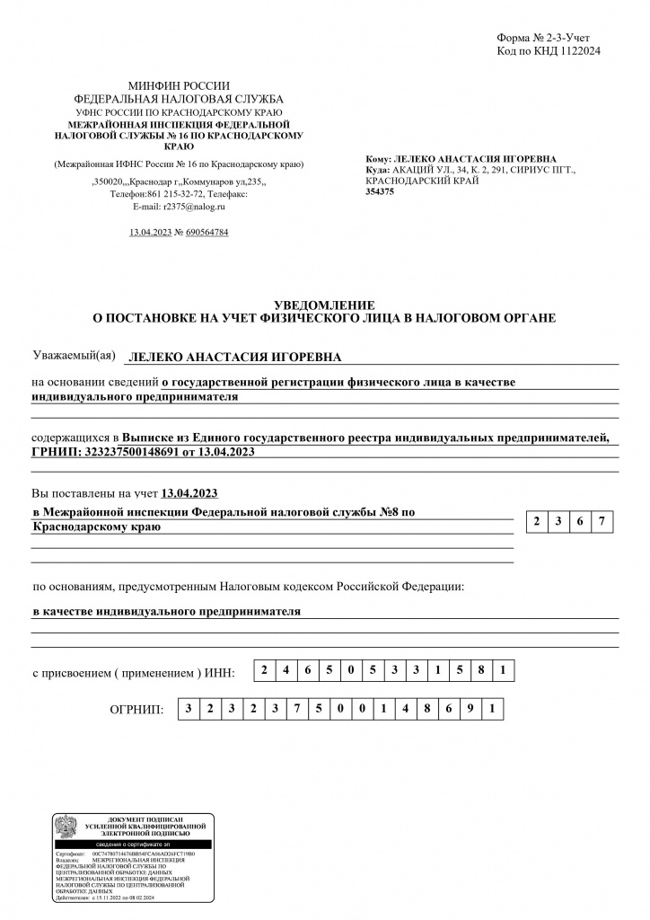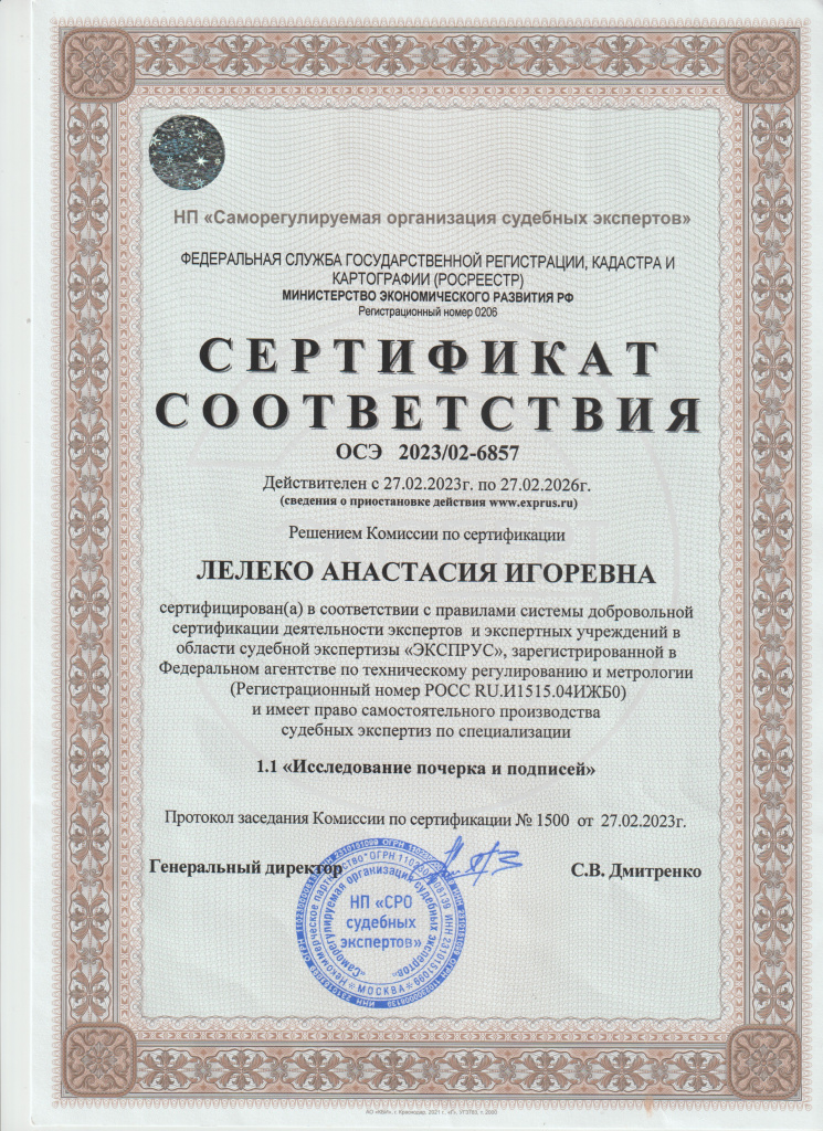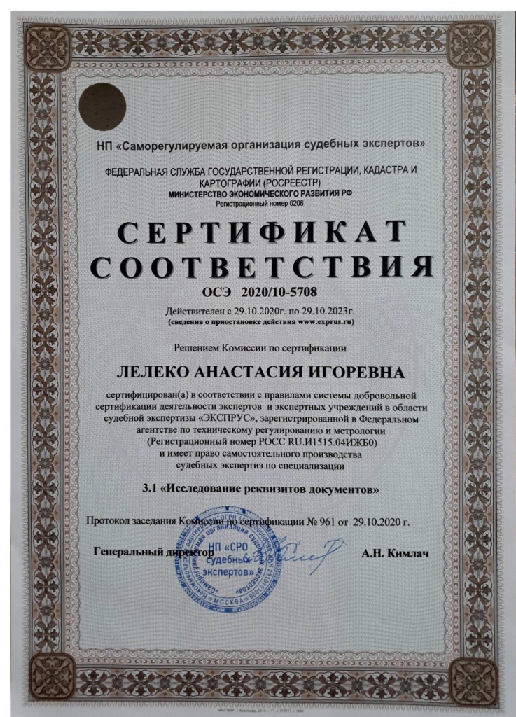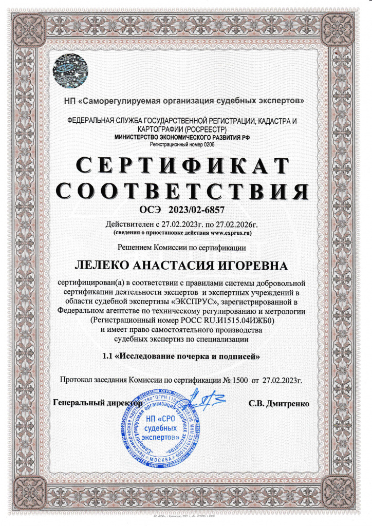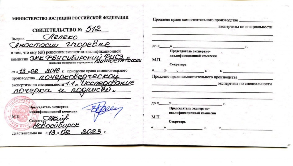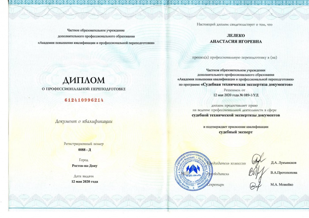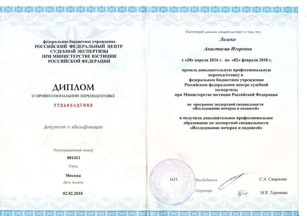 Прошла профессиональную переподготовку в ФБУ РФЦ СЭ при Минюсте РФ (федеральное бюджетное учреждение Российский федеральный центр судебной экспертизы при Министерстве юстиции Российской Федерации) по программе экспертной специальности «Исследование почерка и подписей» и получила дополнительное профессиональное образование по экспертной специальности «Исследование почерка и подписей» г. Москва